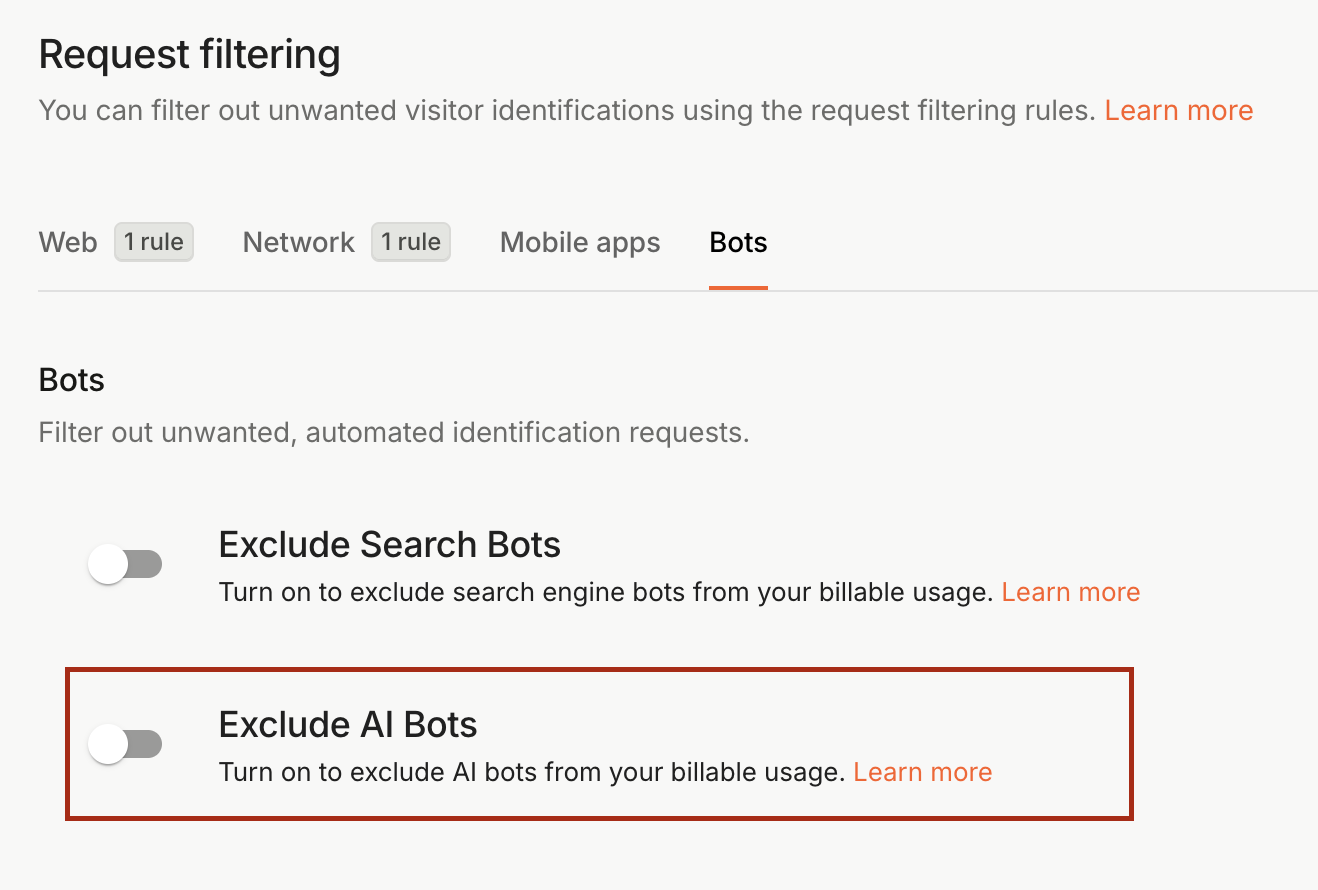 - Enable Exclude AI Bots to start filtering AI bots from your billable API calls.