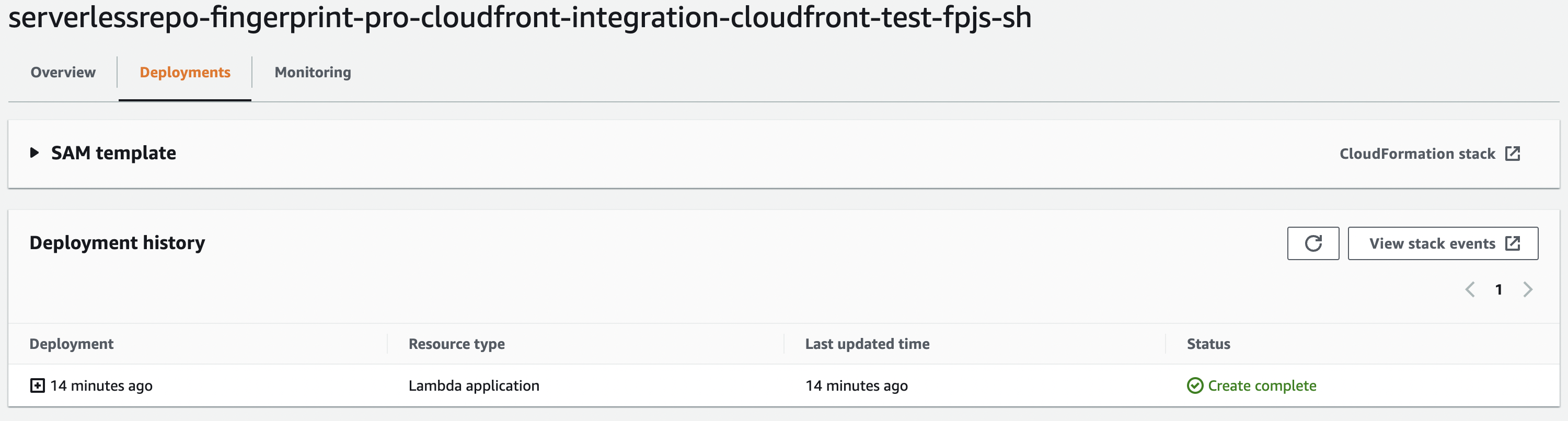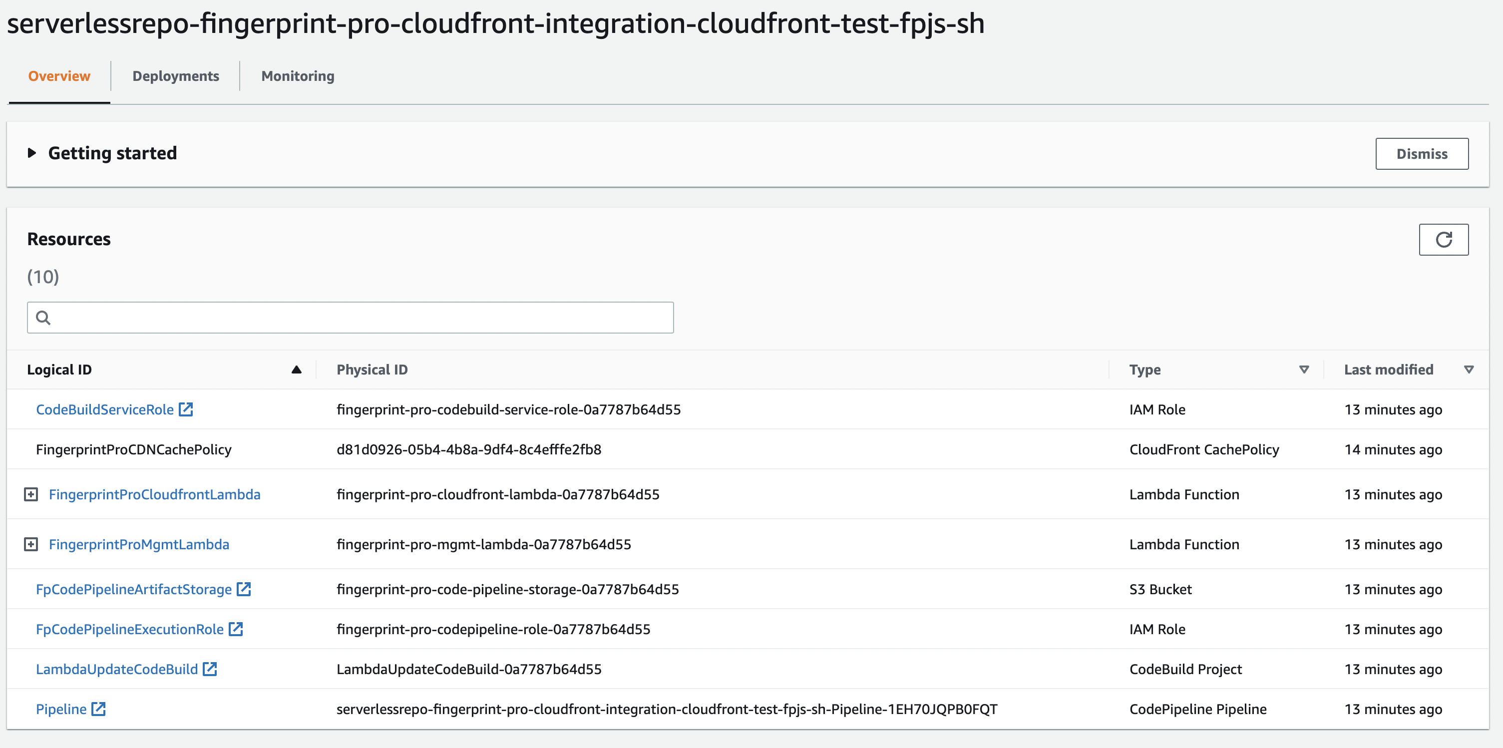 Note: This application creates the custom IAM roles that allow us to modify CloudFront distribution to keep the Lambda@Edge function up to date. You can review these policies in the SAM template.After deployment, you will be redirected to the application page where you can see a list of resources created by the application.