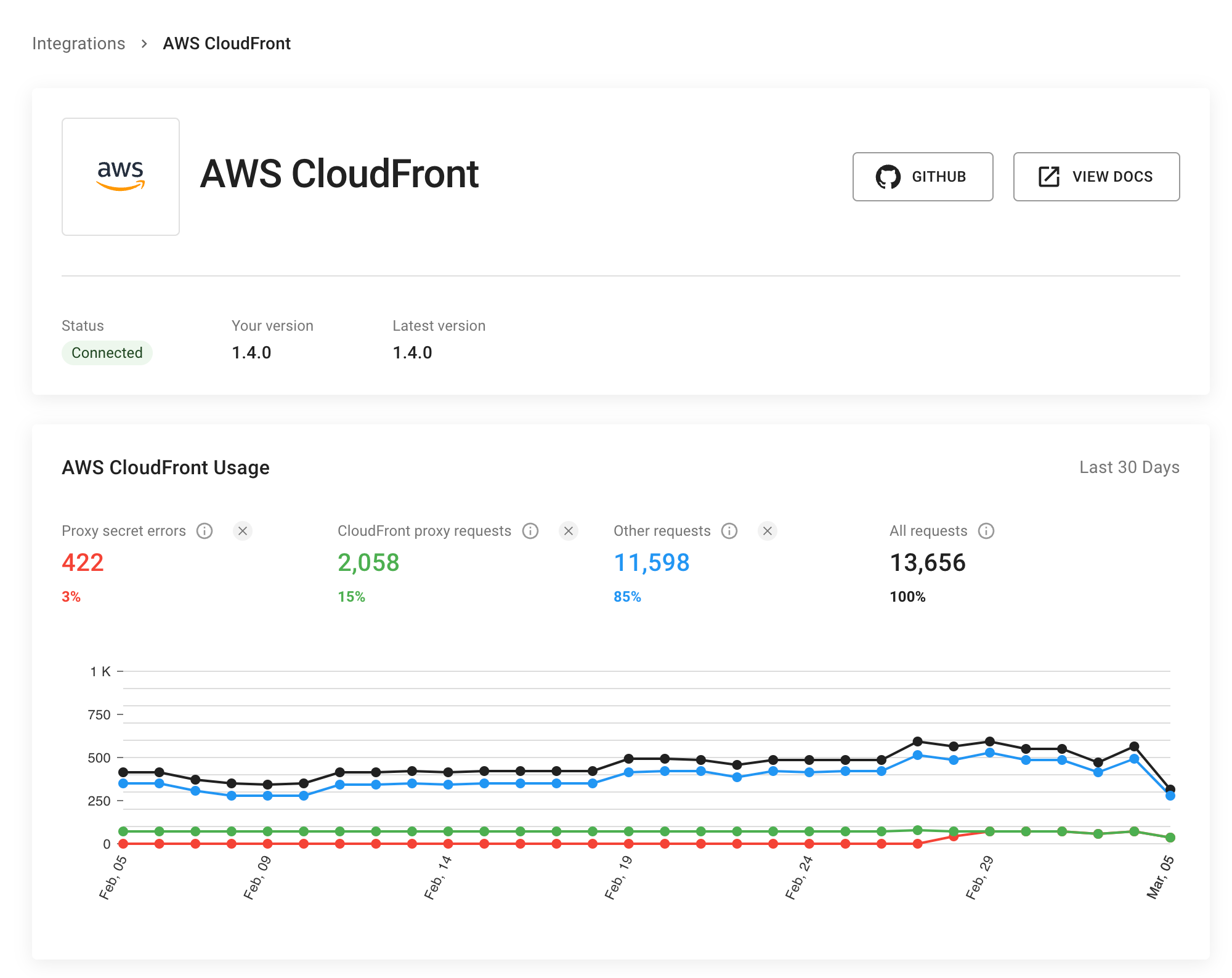 Go to Dashboard > SDKs & integrations > AWS Cloudfront to see the status of your integration. Here you can monitor:- If the integration is connected.