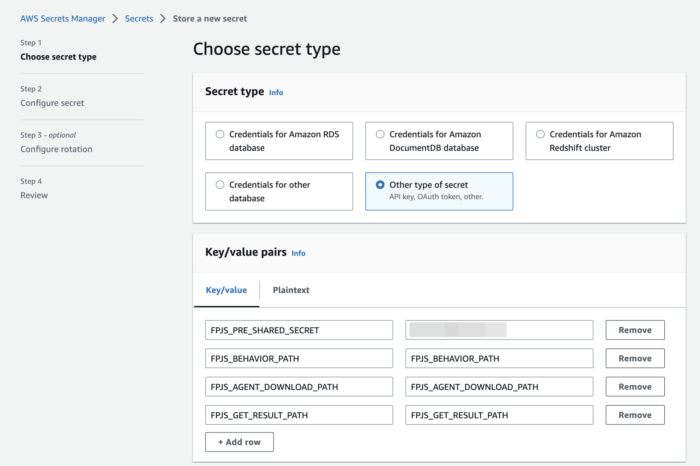 - Choose Other type of secret as the secret type.
