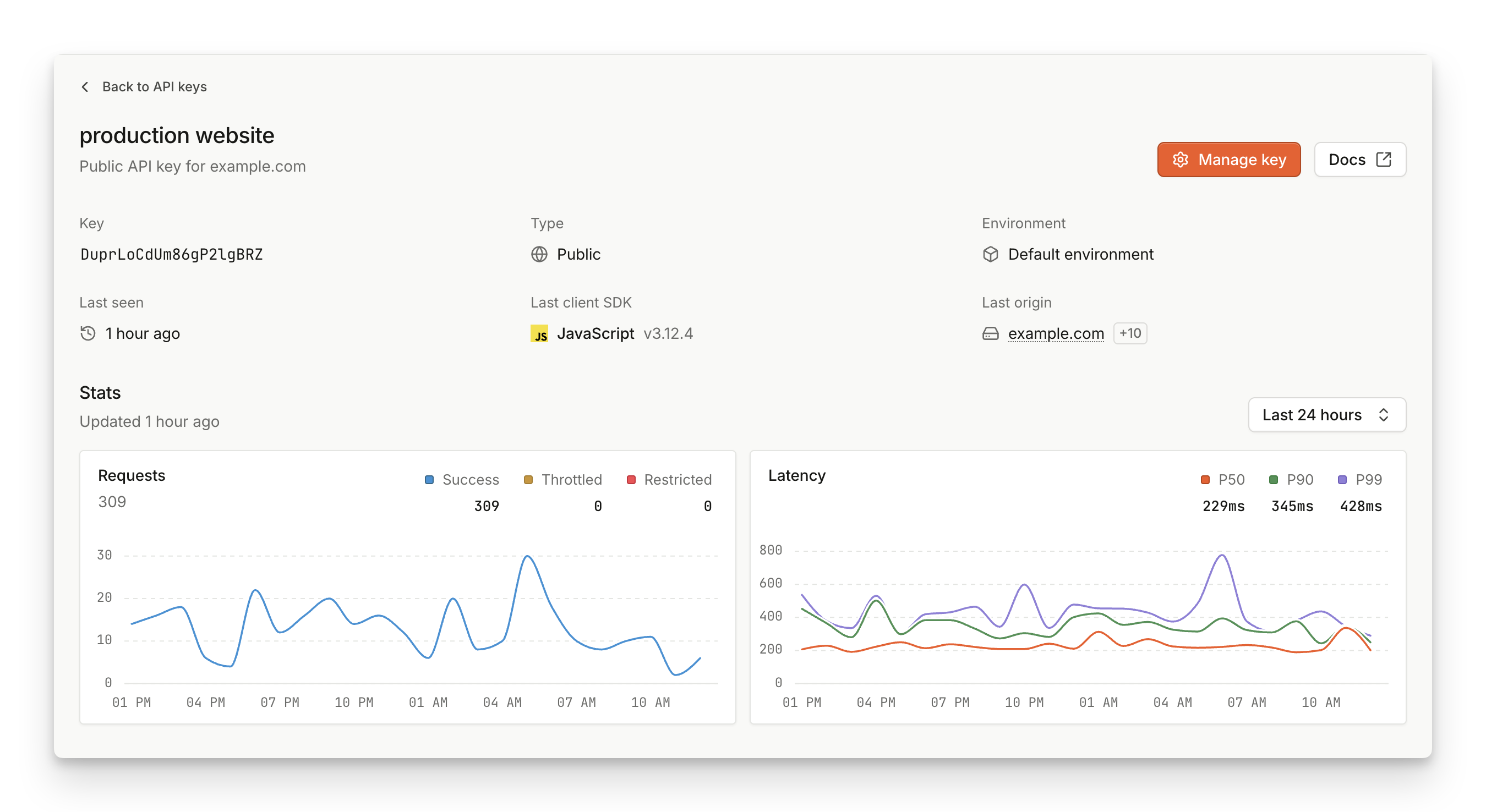 For public and server API keys, you can click on Details to view monitoring information about an API key. On this page you can view when was the key last used, by which library version, and on what origin domains or mobile applications.
