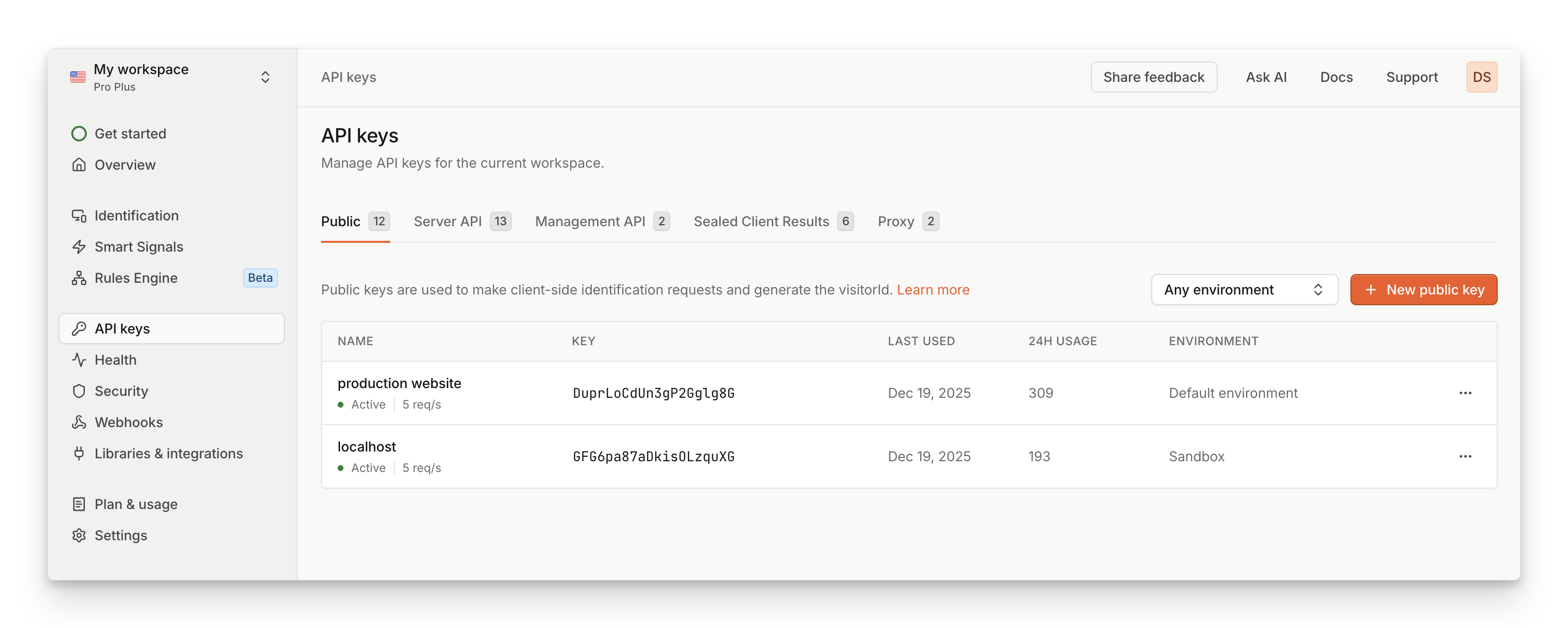 | Public | Used to make client-side requests to identify visitors and generate the visitor ID. Used in the browser or in mobile apps. |
