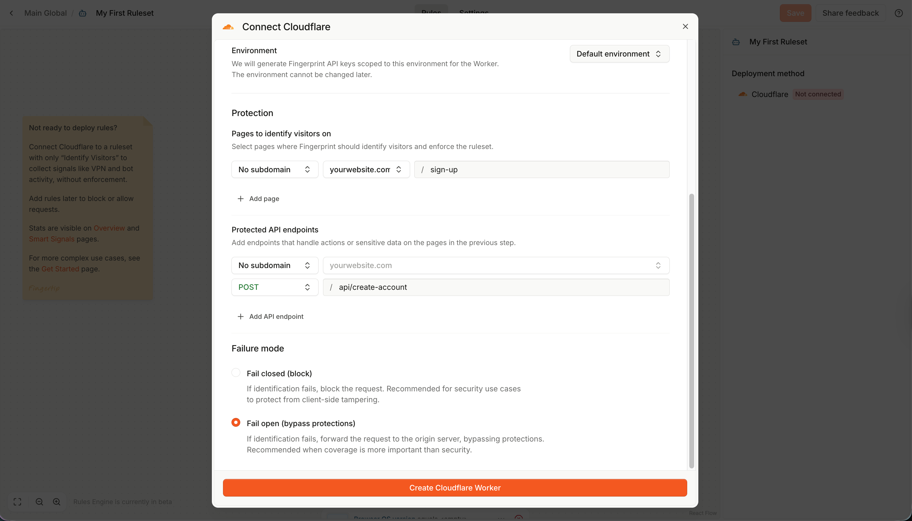 - Define the Failure mode. By default, the worker will Fail open, meaning it will let requests through if an unexpected identification error occurs. We recommend starting with this configuration for the initial testing, then switching to Fail closed for security use cases.