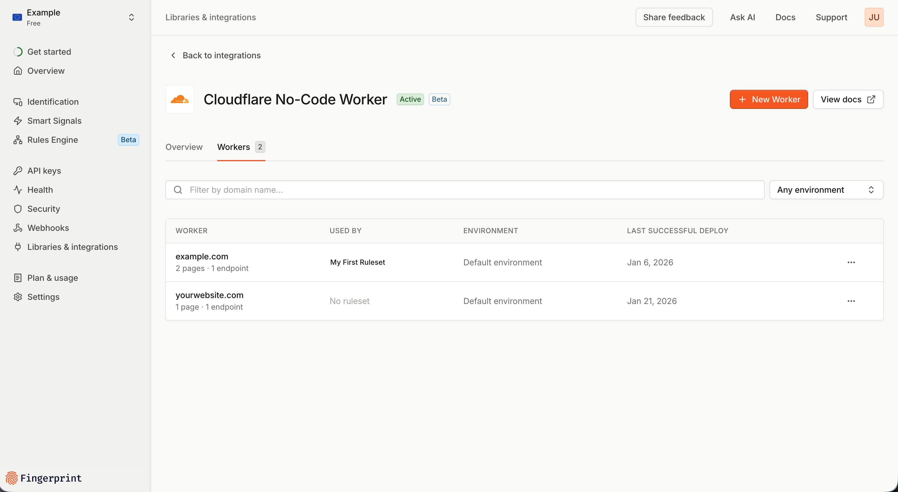You can deploy a Flow worker without a ruleset. This allows you to identify visitors on your website and collect data about your traffic without applying any protective actions. To deploy a Flow worker in monitoring mode:- In the Fingerprint Dashboard, navigate to Libraries & integrations -> Directory -> Cloudflare No-Code Worker.