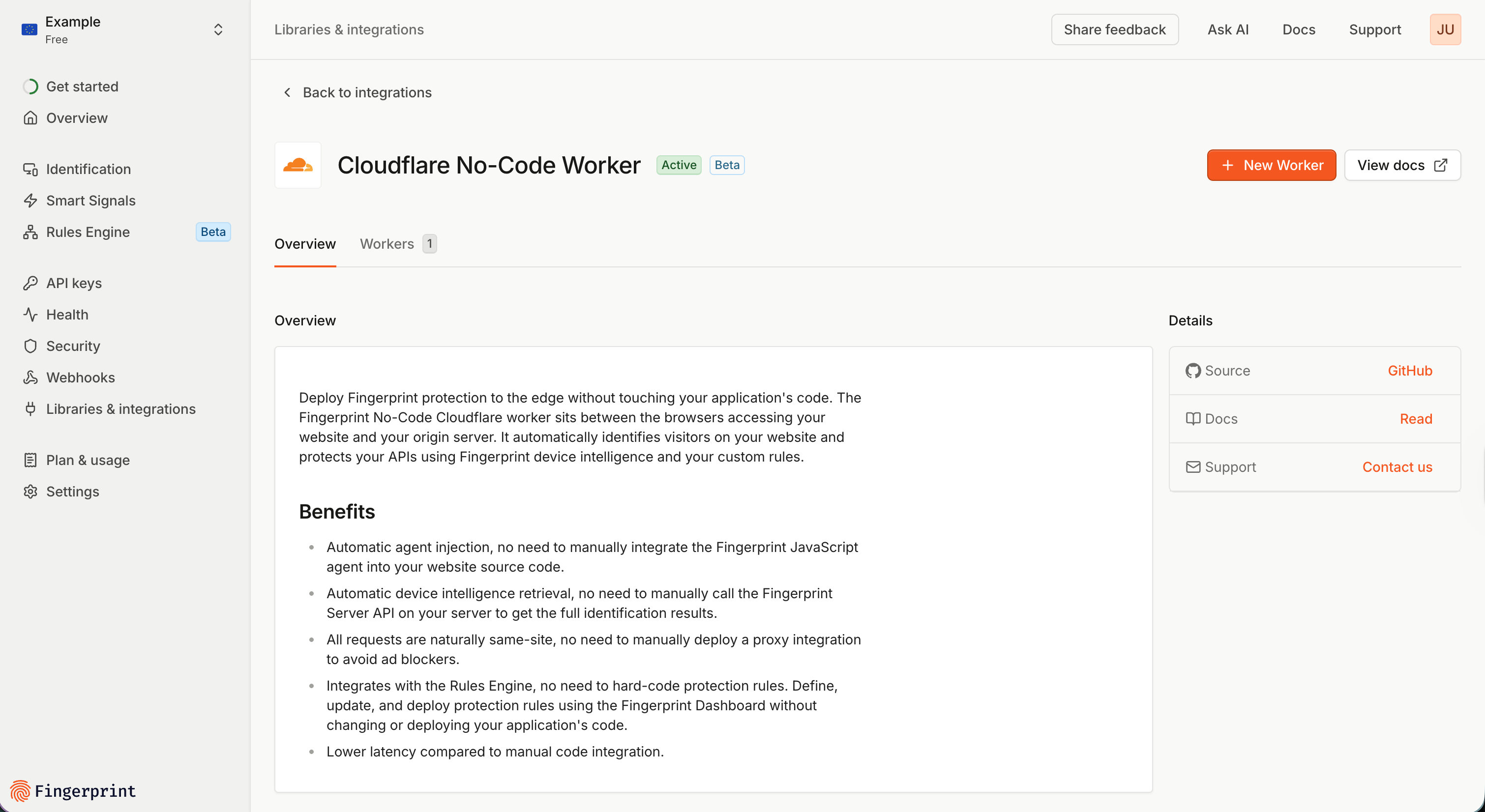 Cloudflare Flow allows you to integrate Fingerprint protection into your website without touching your application’s code. It replaces the need to install the JavaScript agent on your website, set up a proxy to avoid ad-blockers, integrate Fingerprint Server API into your backend, and write custom protection logic based on Fingerprint results.Importantly, Cloudflare Flow deployment is different from the Cloudflare Proxy Integration, which only proxies requests between your website and Fingerprint when integrating Fingerprint manually.