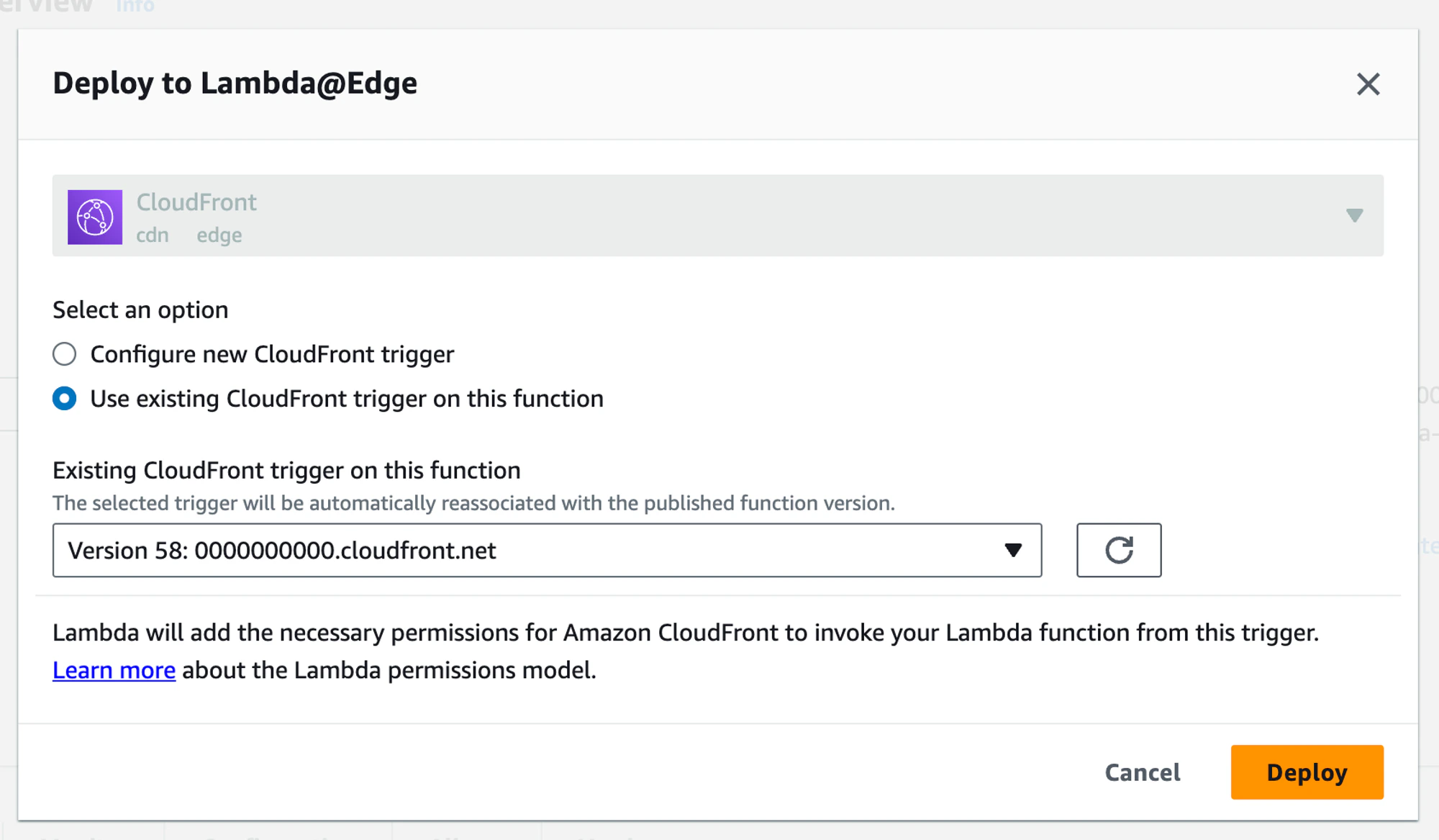 Scroll back up and click Actions → Deploy to Lambda@Edge.