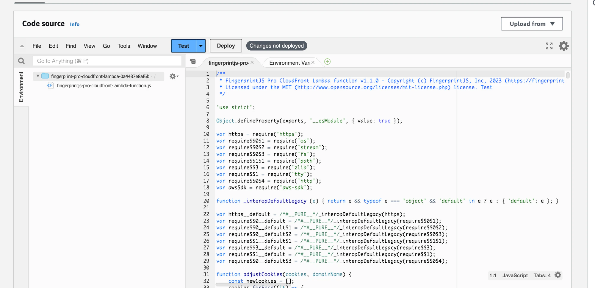 fingerprintjs-pro-cloudfront-lambda-function.jswith the latest Lambda code from the integration’s GitHub repository. Download the latest releasepackage.ziparchive, extract its content, and use thefingerprintjs-pro-cloudfront-lambda-function.jsfile. -