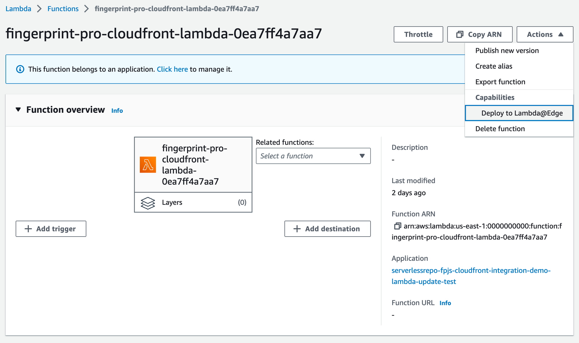 - Open your CloudFront integration lambda function, probably named fingerprint-pro-cloudfront-lambda-some-random-id.