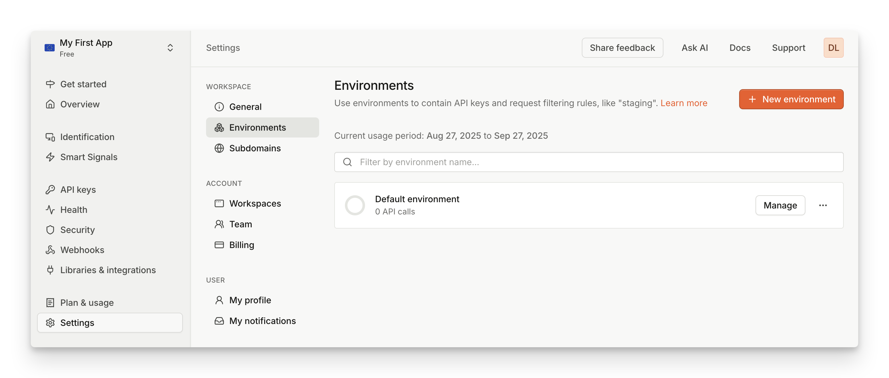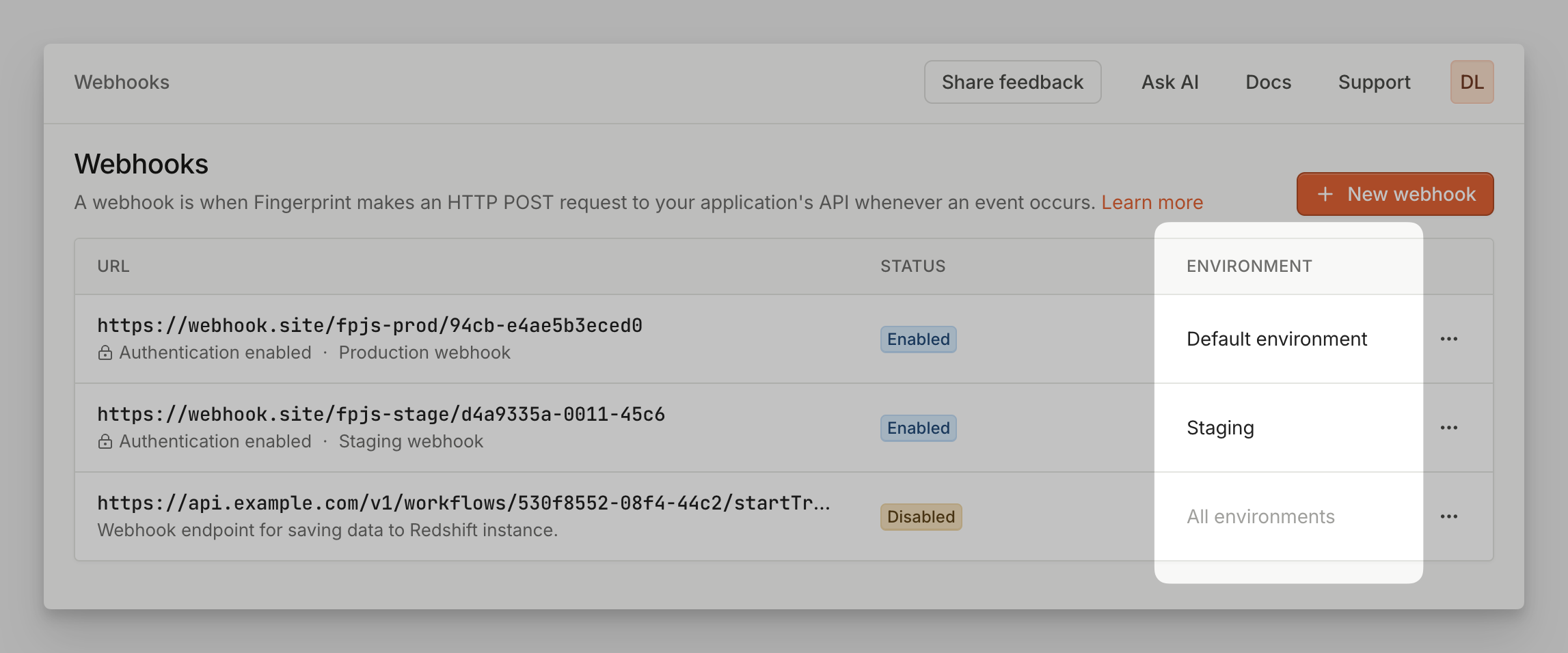 When creating webhooks, you can optionally limit their scope to a specific environment. An environment-scoped webhook will only report identification events from the matching environment. On the other hand, workspace-scoped webhook will report all identification events from the workspace. To manage webhooks, go to Webhooks.