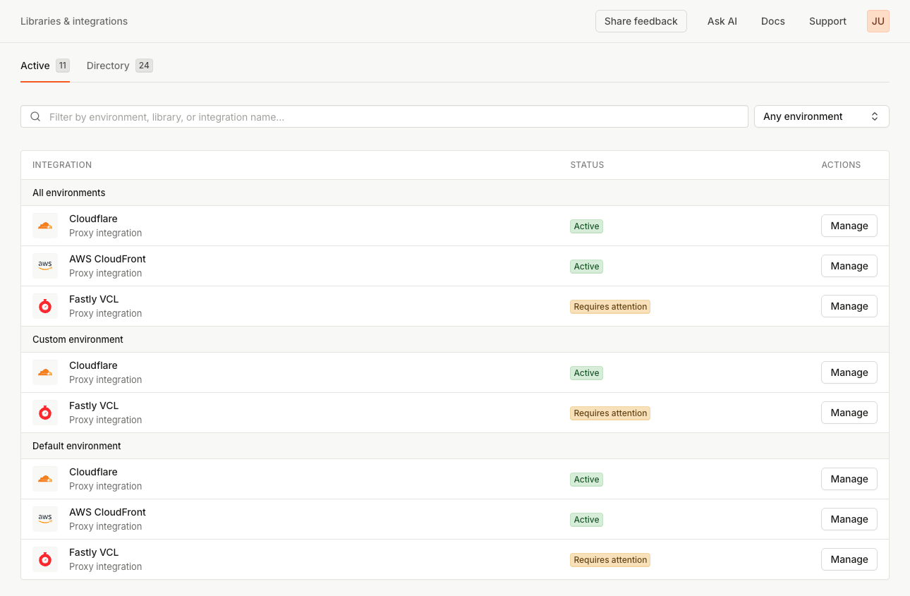 • We do not recommend using multiple integrations of the same type (e.g. multiple Fastly VCL integrations) in a single environment. That setup would make the integrations harder to monitor and troubleshoot. Requests from both integrations would have the same proxy secret environment, so they would be pooled to a single status page in the Dashboard.