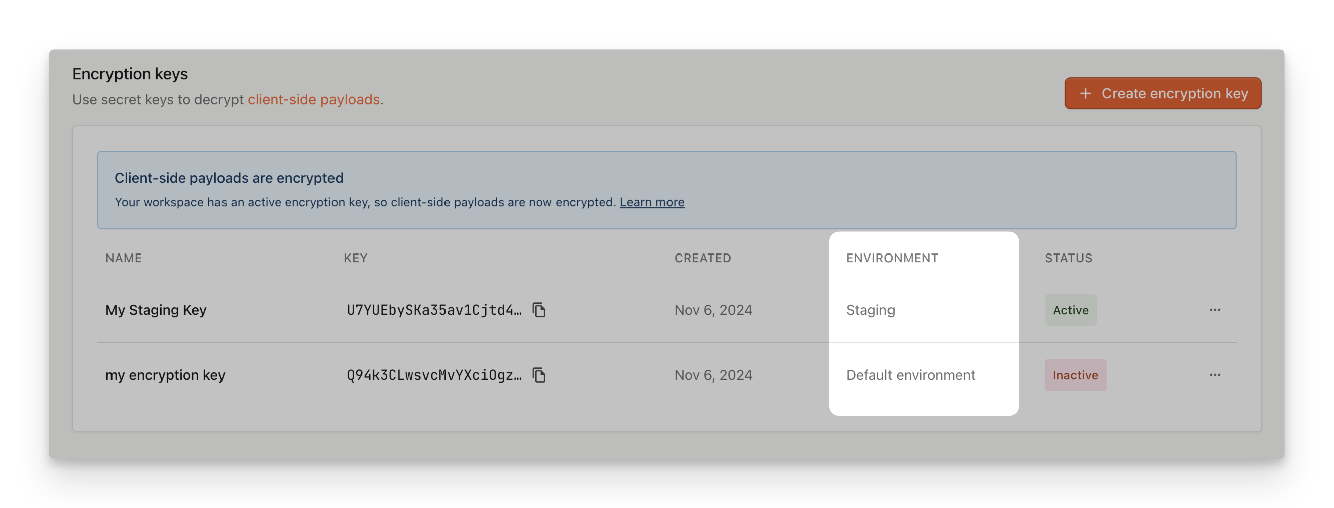 When creating Encryption keys in order to enable Sealed Client Results, you can assign them to specific environment. This will result in client-side payload being encrypted for this particular environment. Other environments will remain unaffected and their payloads will not be encrypted. To manage Encryption keys, go to API Keys and look for Encryption keys section.