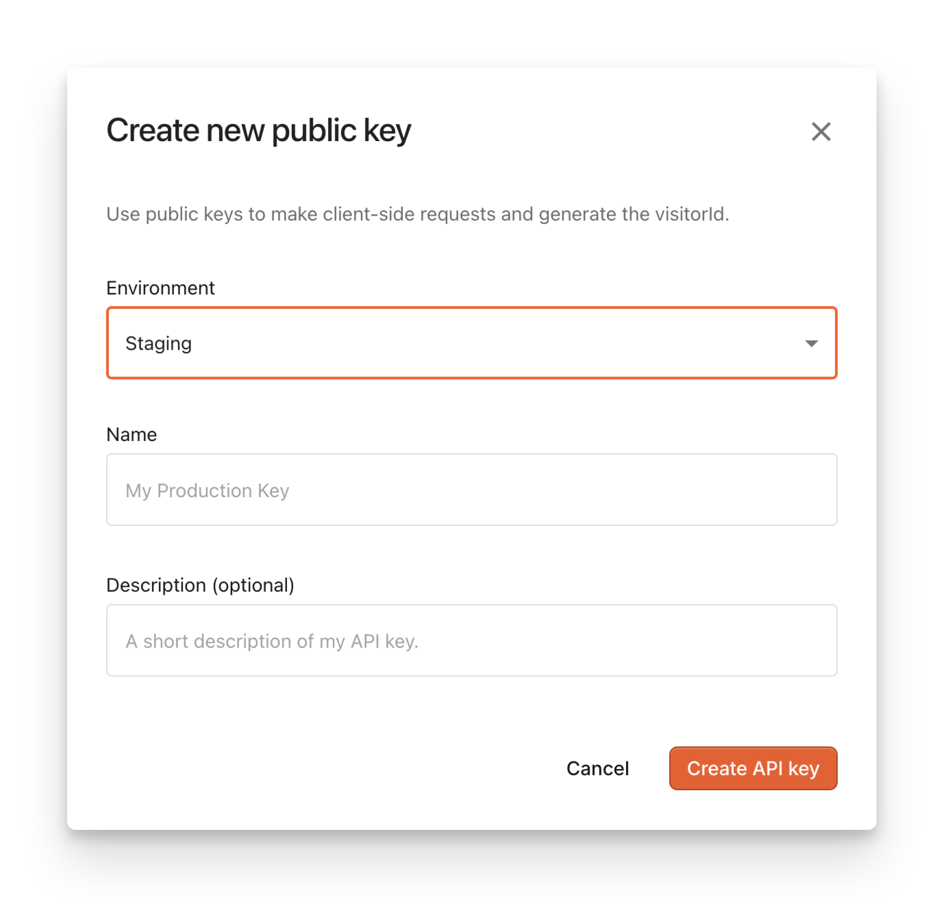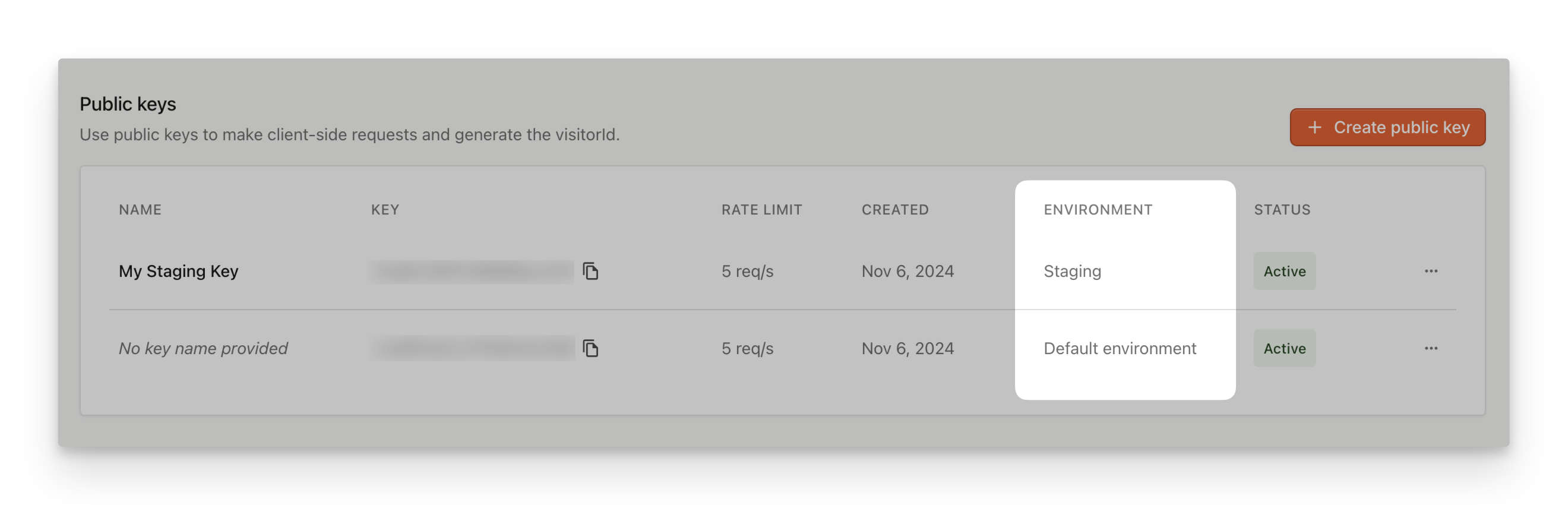 When creating new public API keys, you can assign them to a specific environment. By doing this, identification events registered with a specific environment can then be filtered by different set of request filtering rules. To create a new API key for specific environment, go to API Keys. Changing environment for an existing key is not supported.