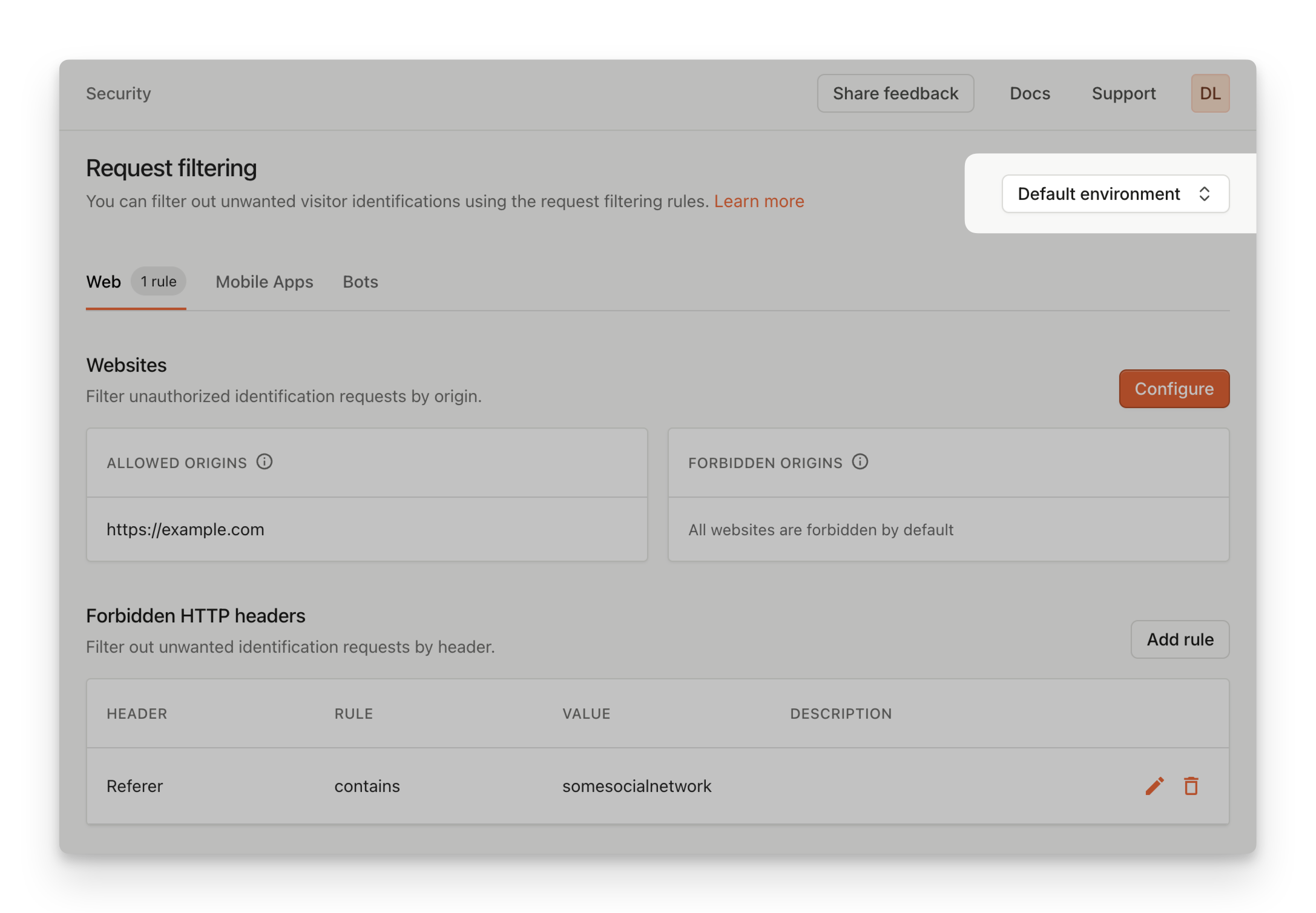When setting up request filtering rules, you can assign them to a specific environment. In combination with API keys, you can create different request filtering rules for each environment, ensuring that you don’t accidentally allow traffic from unwanted origins. To manage environment specific request filtering rules, go to Security. On top of the page, you can select the environment you’re configuring filtering rules for.