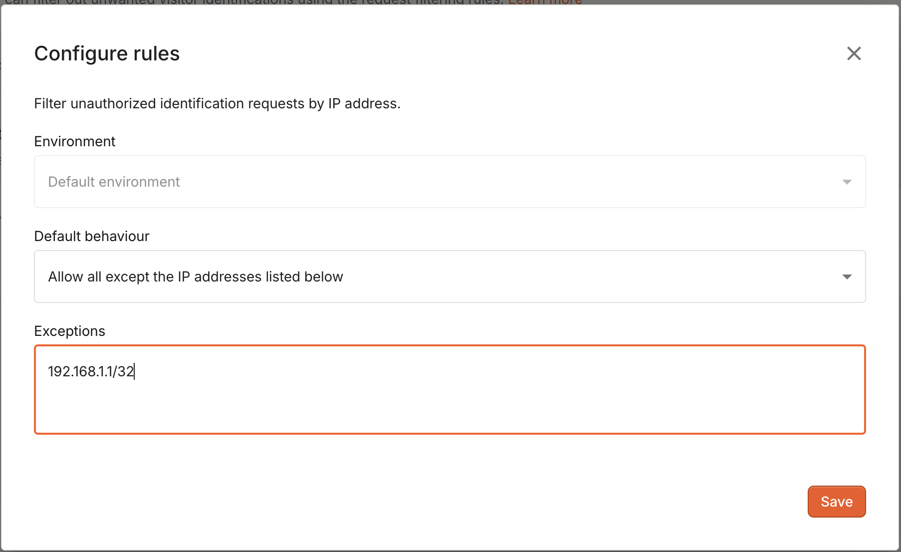The configuration accepts both single IP addresses in the form of192.168.1.1/32 and IP address ranges defined by their CIDR representation (e.g. 192.168.1.1/16).