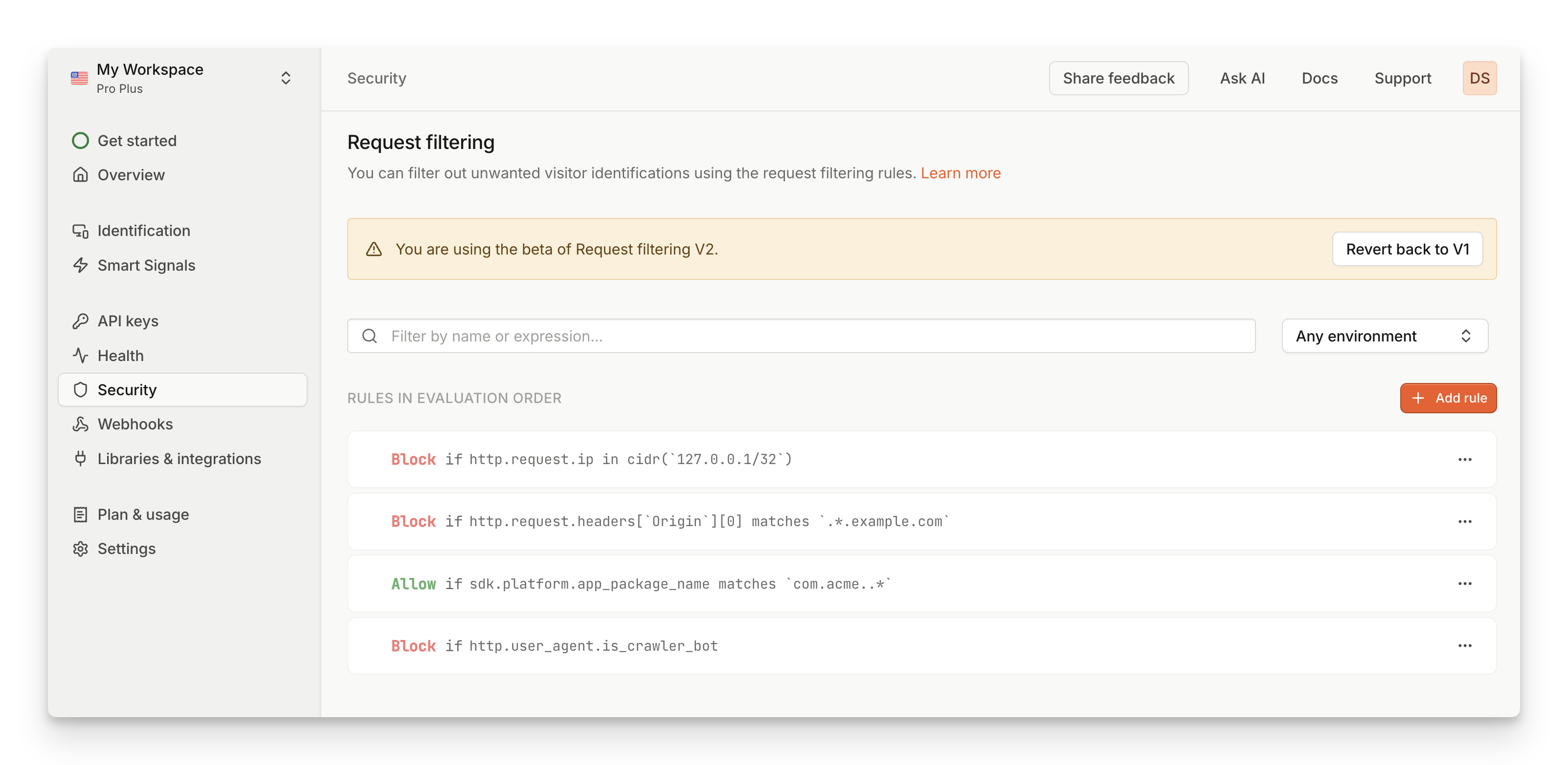 Request filtering V2 is currently in beta, which means that we are still refining the scope and functionalities. If you want access to the flexibility and control the new system offers with expression-based rules, you can contact support to enable you access to Request Filtering V2.Migration steps