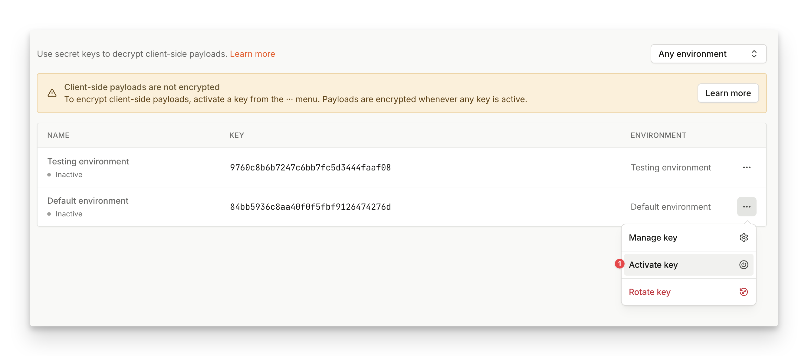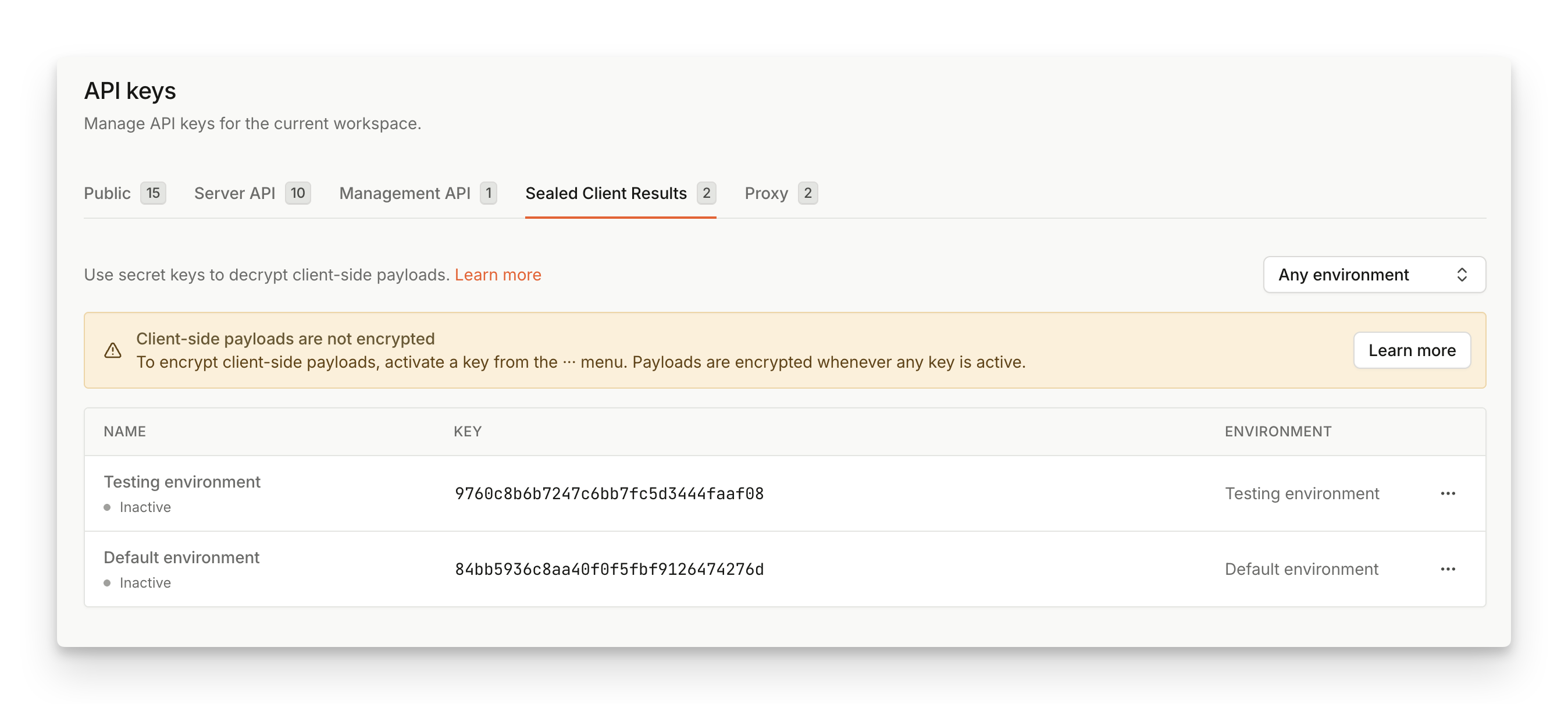 Sealed results are scoped to a specific environment. When creating an environment, an inactive encryption key will be automatically generated. By activating encryption keys, you are selecting on which environment you want payload to be encrypted. If you’re utilizing multiple environments, this means you can partially select for which environment you want to turn on Sealed Client Results. Payloads will only be encrypted on environments with an active encryption key. On other environments, payload will remain unchanged. This is beneficial if you would like to incrementally integrate Sealed Client Results into your multi-environment setup, or if you’d like to test Sealed Client Results on a smaller chunk of traffic before rolling it out everywhere.Key Rotation