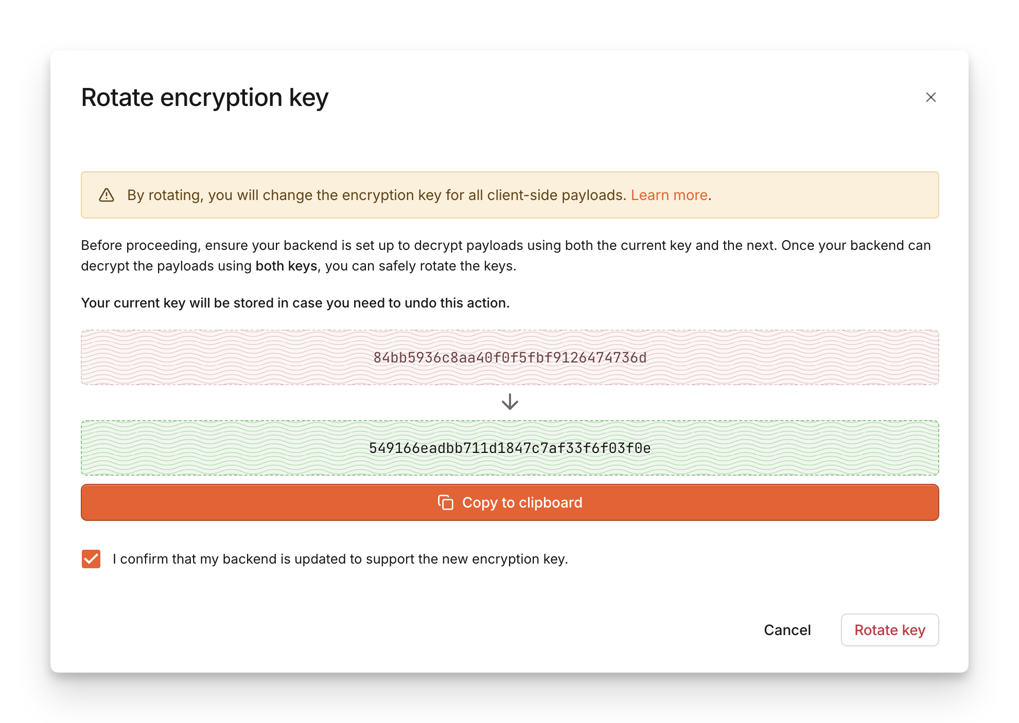 - Once your backend is ready to work with the new key, return to the dashboard and re-open the rotation dialog from step 2.