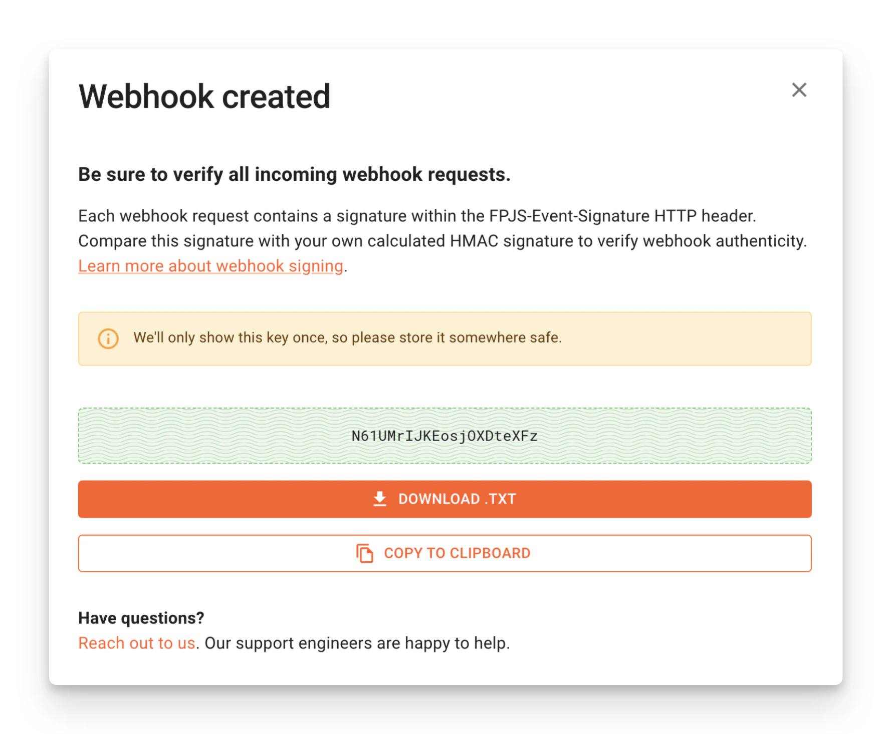 - If you use Webhook signatures to verify the incoming webhooks (recommended), make sure to download or copy the encryption key shown on the success modal. The key is only shown once.